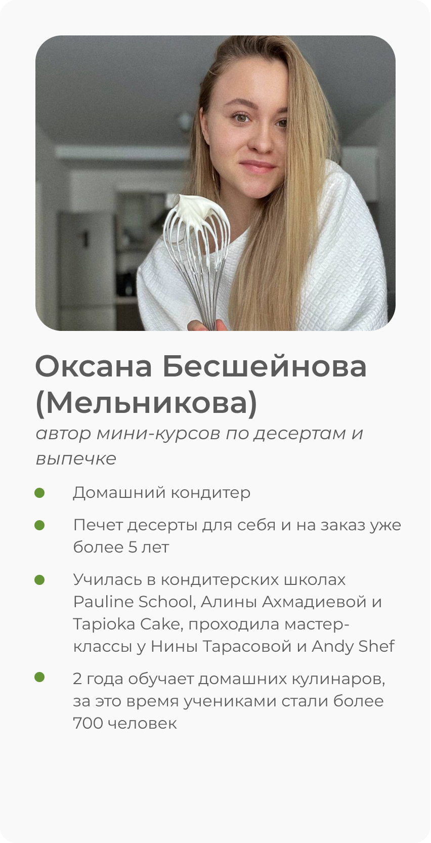 При выборе школы привлёк внимание приятный Голос Владимира, доброжелательность в речи и приятный посыл, что получится у каждого. Спасибо за 2 месяца интересного и вкусного опыта!