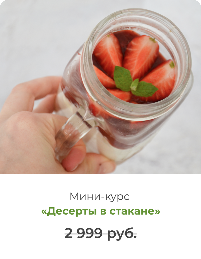 в мини-курсе «Десерты в стаканах»:сахар, пектин, желатин, песочное печенье или ингредиенты для бисквита, сливочное масло, сливочный/творожный сыр, сливки 33%, сгущенное молоко, йогурт (не все сразу - в разных рецептурах используются разные комбинации). В качестве, начинки используем доступные фрукты - бананы, персики и т.д. и ягоды с ваших грядок - клубнику, малину, черную смородину и т.д.